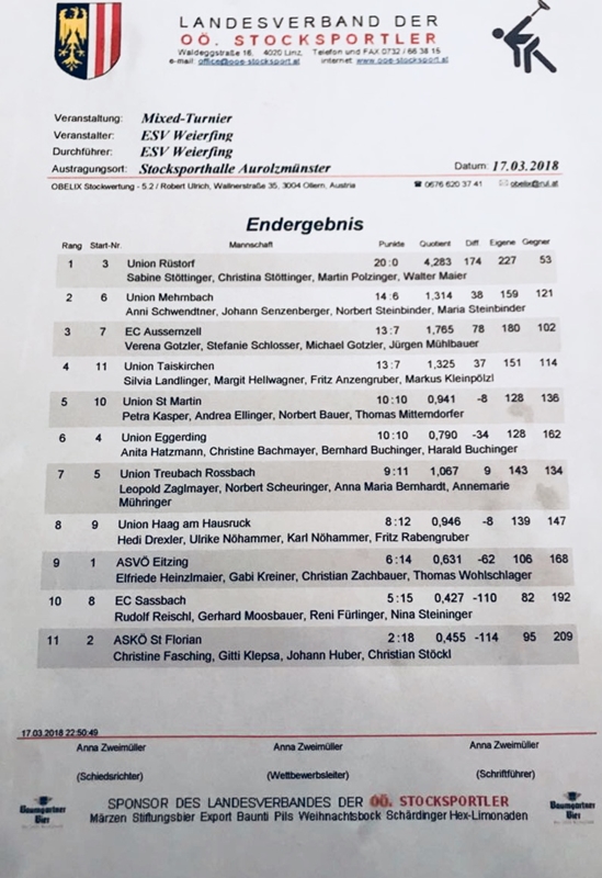 Mixed-Turnier am 17.03.2018 vom LVB der OÖ. Stocksportler in Weierfing