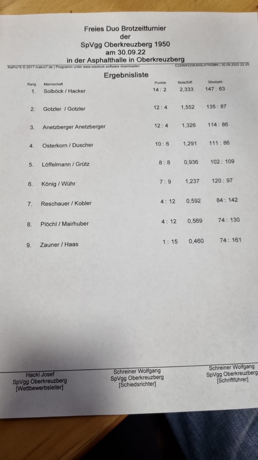 Freies Duo-Brotzeitturnier des SpVgg Oberkreuzberg am 30.09.2022