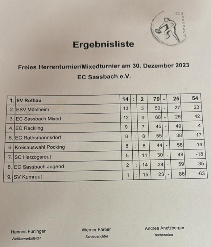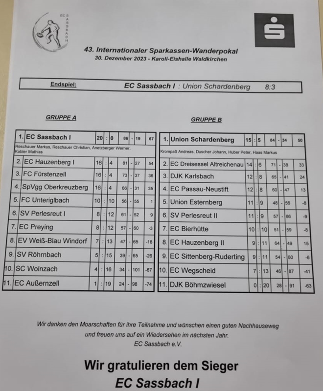 Vorheriger Beitrag: Jubiläumsturnier Zuckenried 31.12.2023 Regen Zurück Nächster Beitrag: Spöckner-Cup 23.12.2023 Waldkirchen Weiter